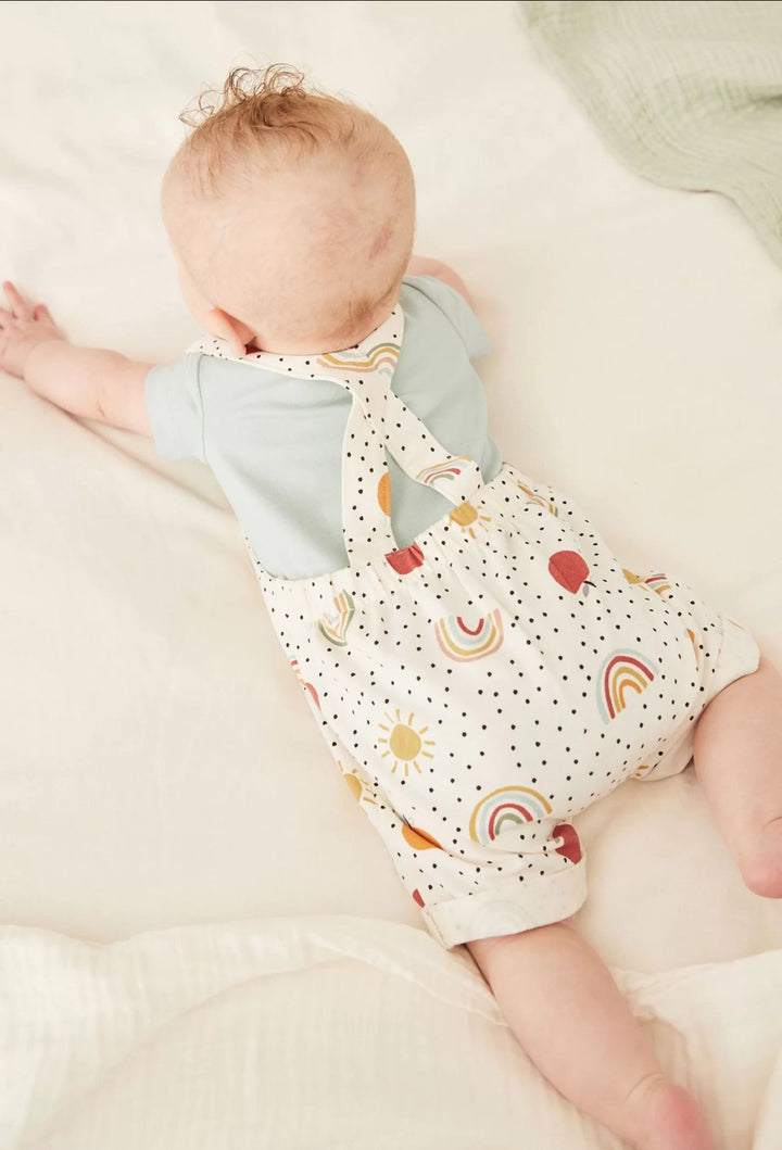 Bodysuit 95% Cotton, 5% Elastane. Dungaree 100% Cotton.